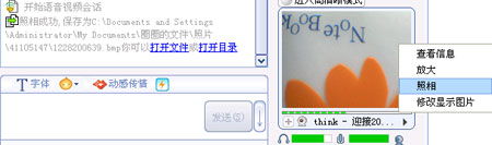 同样点击视频图像旁边的那个小三角,会看到“照相”按钮,就可以把自己的和好友的精彩镜头随时抓拍下来。圈圈应该会帮你自动保存到电脑里“圈圈的文件”文件中,不需要麻烦截图另存什么的。