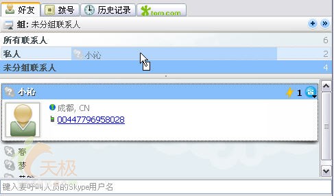 评述:第一印象绝对简约,从界面上看不出什么特别的功能;下边醒目的呼叫按钮在提醒用户,此软件的主要功能是网络电话。