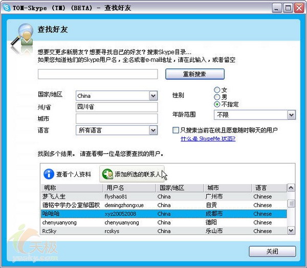 首先在主界面上单击“查找好友”按钮,在接着弹出的如图3所示对话框中,可以定制搜索范围,比如地区、省市等;单击“搜索”按钮后稍等,即会查看到搜索结果。然后单击选中一个联系人,再单击“添加所选的联系人”按钮。