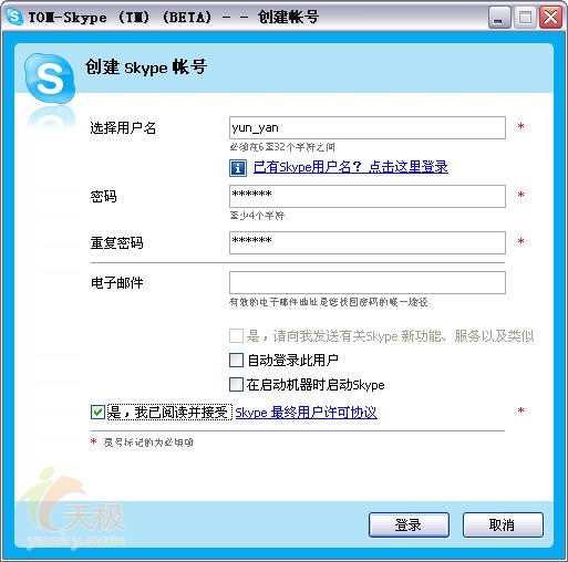 如果你还没有Skype的使用账号,可在初次启动界面中单击“还没有Skype用户名”选项,接着会弹出注册对话框;按选项填写即可,如图2所示。