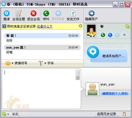然后会弹出如图6所示聊天窗口。从图中可以看到,其聊天辅助功能比较有限,只提供了表情及聊天文字字体修改两项,发送信息默认快捷键为“Enter”,可以通过;最上一排工具栏里的“会话主题”可以为群聊建立不同的窗口,这有利于自己分辨;值得一提的是“发送文件”功能,一是如果没有通过对方的验证,是不能成功发送文件的,另外如果是在群聊时发送文件,可将一个文件分发给参与的第一位好友。
