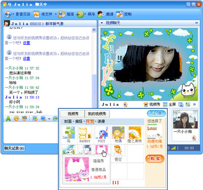 一成不变的视频好单调,想在视频的时候有一些不一样的体验?使用全新的QQ视频秀, 可以为好友视频换上各种好玩的主题。快快给好友设置QQ视频秀,整蛊搞笑随心所欲。您还可以拍下带有您喜欢的视频秀主题的好友视频的精彩瞬间。
