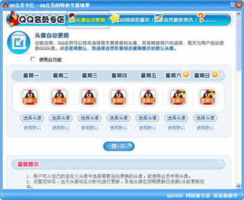 星期一,星期二,星期三……想每一天都拥有不一样的QQ头像么?QQ会员可以预先选择每天想要更换的自定义头像,由系统每天自动更换。会员自动更换头像,每天的好心情从头开始,尽显个性无穷。