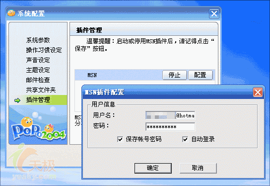2. 登录POPO,在其主界面中执行“工具”菜单→“系统配置”命令,再从弹出窗口的左侧点击“插件管理”标签,然后再点击“配置”按钮,在弹出的“MSN插件配置”窗口中输入好您的MSN帐号与密码。如图2所示