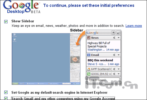 安装过程中,会弹出提示,需要要先设置有些首选参数,比如“show sidebar”(是否显示侧边栏),是否将google设置为默认的搜索引擎,是否搜索Gmail中的文件等: