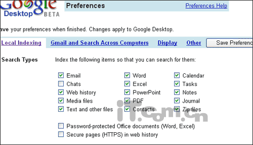 同时,默认情况下“Password-protected Office documents(有密码保护的OFFICE文件)”和“Secure pages in web history(浏览器历史记录中的页面)”两项也没有被选中,看来google在尊重个人隐私方面给大家提供了选择,而不是默认的强制搜索。