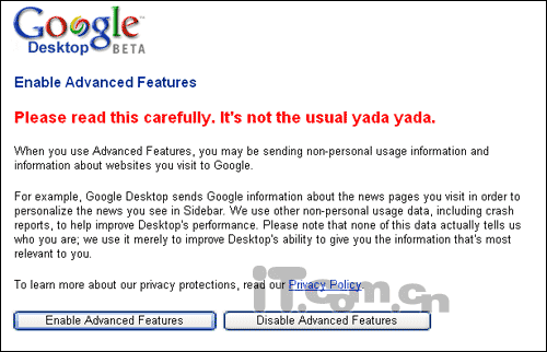 接下来会提示是否启用高级设置,当你启用高级设置时,该软件会自动发送一些你使用的非个人隐私信息以及你通过GOOGLE访问的网站的相关信息。比如你使用google 桌面搜索后侧边栏中出现的信息,还包括该软件出错的一些信息。启用高级设置的目的是为了获取更多的相关信息,从而提高桌面搜索的能力。这里我们选择“Enable Advanced Features”。