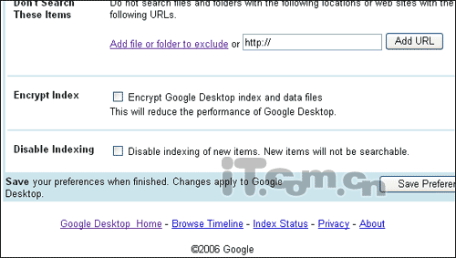 值得一提的是,这次的新版本允许建立密码索引“Encrypt Index”,勾选“Encrypt Google Desktop index and data files”即可在尽力索引文件时对索引数据文件进行加密。
