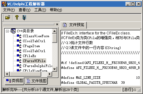再者该工程中涉及到了几个文件解析类,CParseDelphiFile类和CParseVCFile类,这两个类从基类CFileEx继承而来,都和具体的应用有密切的关系,它们主要完成了Delphi工程文件的解析,Delphi代码文件中类的解析和类函数的解析功能。而后者则主要完成了VC工程文件的解析,VC源文件中类的解析功能。该工程还使用了停靠类,活页类,任务栏操作类和超级联接类 该工程涉及了很多底层的文件操作内容,例如:如何在程序文件中过滤注释行和字符串内容等,我想只大家稍做修改就可以做个代码注释率统计工具。工程中还有如何注册热键,如何特效显示对话框,如何在对话框中添加工具条(CToolBar)和如何在工具条上使用256色图标等等。说实话里面的内容很多,所以献给大家,希望能对大家有所帮助!