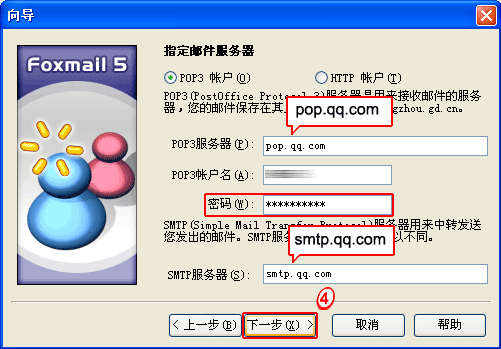 4. 选择 POP3 帐户,POP3服务器处填写:pop.qq.com,SMTP服务器处填写:smtp.qq.com,并且输入您的密码,点击“下一步”。