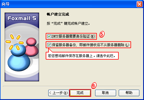 5. 在 “SMTP 服务器需要身份验证”栏前的空格打勾,若您想将邮件保存在服务器上,请在“保留服务器备份,即邮件接收后不从服务器删除”栏前的空格打勾。所有邮件将会收取到本地计算机上,在其他计算机上将不能通过webmail或者客户端收取这些邮件。
