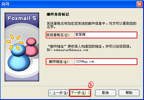 3. 输入“发送者姓名”和您的邮件地址,点击“下一步”。当您发送邮件时,“发送者姓名”将出现在外发邮件的“发件人”字段。请输入您想显示的名称。