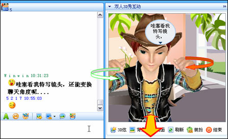目前,QQ 2006 beta1及以上版本可实现3D秀实时互动、场景式聊天体验模式。在3D聊天模式下,聊天过程中用户发送该表情,3D秀会做出相应表情以及动作;对话会在3D聊天框以冒泡的形式展现,冒泡一次最多显示10个字,超过部分以省略号展示,此时出现下拉箭头,用户鼠标移上去可对文字其进行滚屏操作;