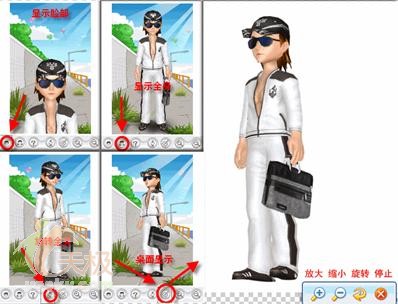 在试穿的步骤就可以体现出3D秀的乐趣了,您注意到在形象窗口下方有一排功能按钮,它们分别对应3d形象的各种不同的展示方式,下面的图详细的展示了这一点。