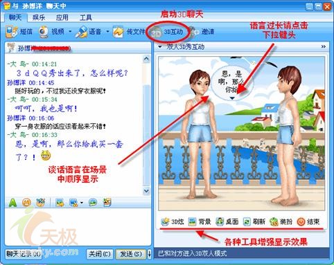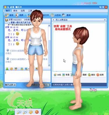 打开聊天窗口,明显可以观察到位于上方的工具栏布局发生了变化,增添了3D互动工具按钮,使用它可以立即进入全新感觉的3D聊天体验。对方回应后,您就可以在右侧的窗口之中看到各自形象了(目前只有双方都有资格体验3D秀并且登陆过网站一次后才可以进行)。