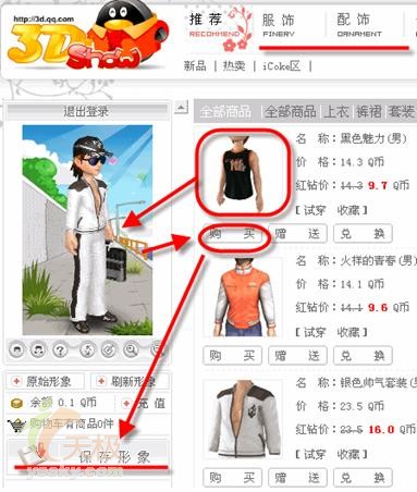 3D商城与普通QQ秀商城十分类似。原始的3D形象在页面左侧,右半部分是各种商品。全新的3d形象造成的视觉冲击的确让人耳目一新,如果您也想要拥有自己的一身3D秀,其流程与普通QQ秀大致相同。试穿—保存形象—购买—设置形象,各身衣物确实是让人心动,不过价格也不菲哟,您可一定要想好了再进行购买,每件衣物的有效期是两个月,完后您需要续费方可继续使用。