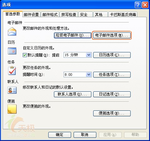 2.单击“首选参数”选项卡中的“电子邮件选项”按钮。