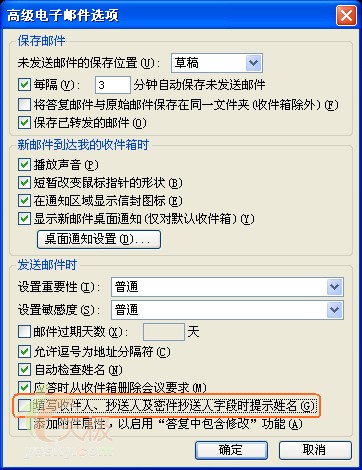 5.在“高级电子邮件选项”对话框中取消选择“填写收件人、抄送人及密件抄送人字段时提示姓名”复选框,如图5所示。