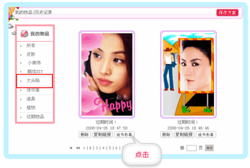 进入“装扮空间”,在“我的物品”,大头贴专栏下,您可以找到您照过的大头贴。点击 ,您就可以把您喜欢的大头贴设为首页“个人资料”的形象啦!