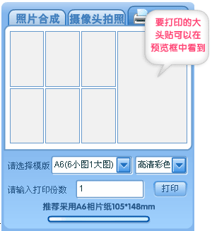 点击 ,您就可以进入页面 ,您只需通过单击预览框,再点击右边您想要打印的大头贴,就可以将您想打印的大头贴放到预览框中了;您还可以选择模版(现在三种模版供选择),打印方式,打印份数等。点击 ,呵呵!看到您喜爱的大头贴了吗?