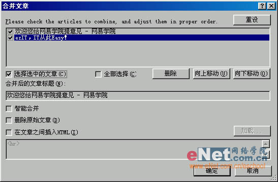 这个功能可以使网文快捕中的两篇或多篇文章进行合并,方法如下:用右键点击要合并的文章,在弹出的快捷菜单中选择“合并”,这时弹出“合并文章”的对话框(如图1),选择好需要合并的文章,然后把它们排好顺序,写好合并后的文章标题,点击“确定”即可。“智能合并”是指合并文章的正文部分。