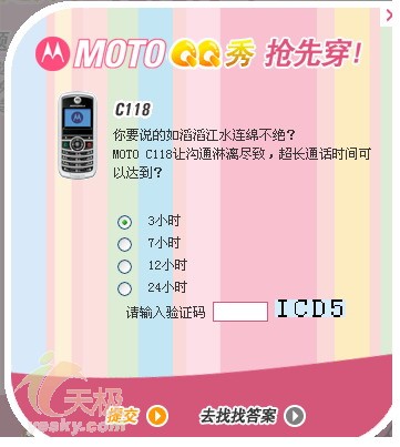 最近MOTO与QQ共同开展免费送QQ秀活动,我们可不要错过了,首先进入http://www.motorola.com.cn/c-series/landing_qq.asp 的活动页面,里面会摆放出不同款式的MOTO手机四部。你可以任意选择其中一部手机,作为回答问题的标识手机,并且每款手机背后,所出现的问题也是不相同的。