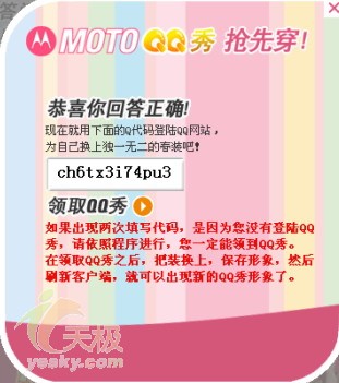 这里笔者已经找到了答案,切换到问答页面,选择“12小时”的单选框标签,然后在验证码标签处,输入当时所显示的ICD5字符,单击下方“提交”按钮,会出现“恭喜您回答正确”的画面(如图2),还会获得获取QQ秀Q码一个,将其记住在脑海中。