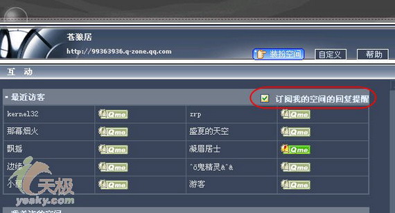 第三步:在“互动”面板中,勾选“订阅我的空间的回复提醒”(图3),这时会弹出“订阅空间回复提醒成功”(图4)的对话框,点击“确定”按钮,然后退出空间。