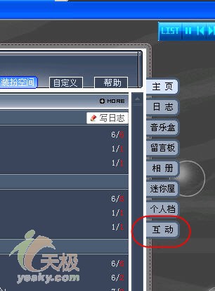 第二步:进入“QQ空间”后,点击右侧面板中的“互动”按钮(图2)切换到“互动”面板。
