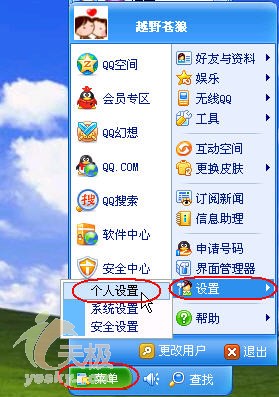 第一步:在QQ面板中,依次点击“菜单→设置→个人设置”(图1)。