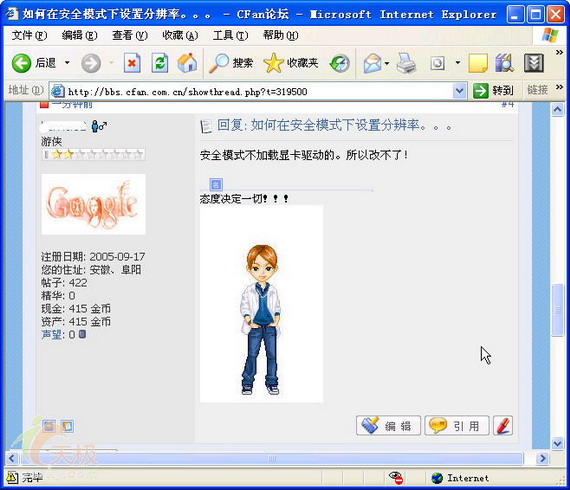 注:以上两种方法各有优劣,方法一较为直观,且不用担心购买的QQ秀过期等问题,缺点也很明显,就是不能显示动态的QQ秀。方法二最大的优势在于可以显示动态的QQ秀,且用户的QQ秀更改之后,论坛签名也能实现动态更新,劣势就是如果用户的QQ秀过期了,论坛签名也就跟着改变了,且如果QQ官方哪天更改了QQ秀的真实存储地址,该方法也就失效了。具体用哪一种,大家根据需要自己选择吧!^-^