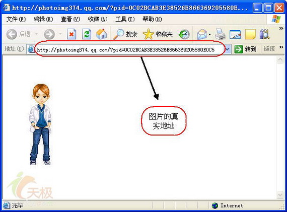 小提示:如果没有自己的网络空间,可以注册一博客,现在的博客网站都提供了网络相册功能,可实现将图片上传到网络上的目的,上传成功之后,可通过查看图片属性的方法得到图片的真实地址。另外也可将图片上传到QQ空间的相册当中,在相册中显示完图片之后,将鼠标指针悬停在图片上面,当鼠标指针呈现手形时单击,即可自动调用浏览器并在浏览器中显示图片,而地址栏中的地址即为图片的真实地址(图4)。