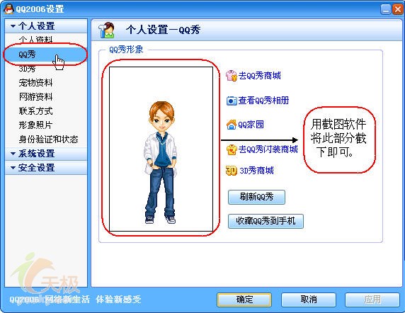 第二步:在弹出的“QQ2006设置”对话框中,点击“QQ秀”切换到QQ秀标签(图2),用任一截图软件将对话框中“QQ秀形象”部分截下之后保存为一图片文件。