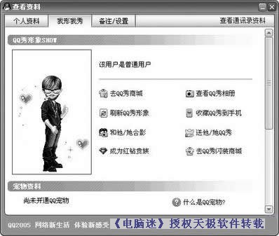 首先从QQ程序“flashshow”目录下的某个“qqshow”文件夹内复制自己想拥有的其他好友的一组共(4个)QQ秀文件到“qqshow8”文件夹内,接着将自己QQ秀对应的那组文件都删除掉(或改名),然后将复制进来的这组QQ秀文件替换原来的QQ秀文件——即将各个文件的文件名中的数字都改为自己的QQ号码。现在登录QQ看一下自己的QQ秀资料(如图2),哈哈,别人的QQ秀已经被我据为己有了!网友提醒:这个方法只能在让自己在本地看到免费免费得来的QQ秀,想别人也看到,就得把图片传给好友,请他按上面的方法把图片放到合地方。
