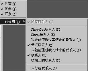 依次点击分组标签上的“显示的组/预设组/最近联系人”菜单(如图),就会增加一个“最近联系人”分组,以后就可以直接在该分组中找到最近的联系好友。用同样的方法,我们也可以为Skype增添“已通过请求联系人”、“被阻止联系人”等。