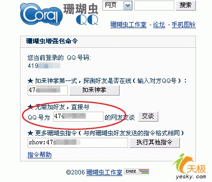 2. 随后,珊瑚虫会打开一个网页,在其中第2栏处我们便可以发现有一个“无需加好友,直接与XX交谈”的栏目。在这里填写好该网友的QQ号码后,点击“交谈”按钮启动临时聊天。如图3所示