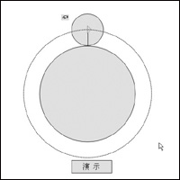 用绘图工具中的椭圆工具绘制出小圆和大圆,大圆的半径为小圆的三倍,再绘制一根直线作为小圆的半径,并将直线跟小圆组合。用矩形工具绘制一个矩形,在其上添加文字“演示”,此图形留作动画的触发器。将三图形放置如图1所示。