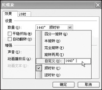 继续选定小圆,在“自定义动画”窗格中单击“添加效果/强调/陀螺旋”。双击刚添加的陀螺旋效果,出现“陀螺旋”设置对话框(如图5),单击“效果”标签,将“数量”设置为“1440°”(这里必须手工输入)。单击“计时”标签,将“开始”设为“之前”(这样这两个动画效果将会同步演示),速度设置为10秒(跟上一个动画效果时间相同),同样的,将触发器设置为矩形。按〔确定〕关闭对话框。