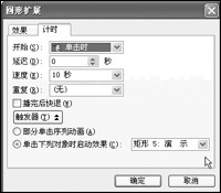 在“自定义动画”窗格中,在刚添加的“圆形扩展”自定义动画上双击,出现“圆形扩展”设置对话框,单击“效果”标签,将“平衡开始”和“平衡结束”两个选项去掉。单击“计时”标签,将速度设置为10秒(直接在里面输入10即可),单击下方〔触发器〕按钮,在“单击下列对象时启动效果”中选择第一步中绘制的矩形,按〔确定〕关闭对话框(如图4)。