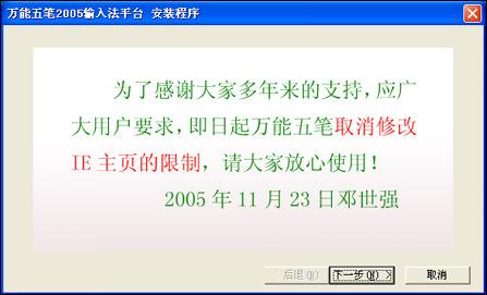 在安装万能五笔2005:6.47版时,我们看到以下图所示,这表明该版已经去掉了修改IE主页的限制。