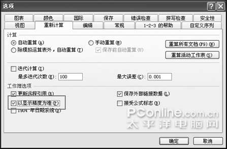 方法很简单,其一是利用Round函数对小数进行精确的四舍五入,其格式为:round(number,num_digits),其中“number” 为需要四舍五入的数字或运算公式,num_digits指定四舍五入的位数。针对本文所述问题,我们只需在D2单元格中输入“=Round((B2+C2)*0.11,2)”,在“E2”单元格中输入“=Round(D2*3.12,2)”即可。另外,我们还可以通过Excel进行一下简单的设置来达到精确计算的目的,点击Excel菜单栏的“工具/选项”,在弹出的“选项”窗口中切换到“重新计算”选项卡,在“工作簿选项”栏中将“以显示值为准”复选框打上钩,点“确定”按钮即可(如图)。