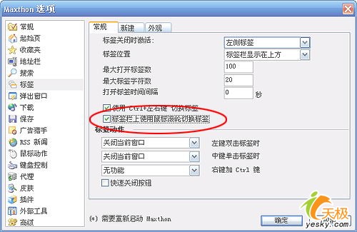 在这几种切换方法中,鼠标切换法大概算得上是最快捷的一种了。使用前,先点击Maxthon的“选项”菜单→“Maxthon选项”命令调出设置对话框,然后再点击窗口中的“标签”一项,勾选上右侧窗口中的“标签栏上使用鼠标滚轮切换标签”复选框后确定即可。如图1所示