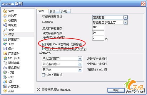 当然,如果您的工作必须长时间双手打字,那么每次腾出手来操作鼠标也很费时,这时,就该让键盘切换法大显身手了。同样,我们在使用之前也要先进入Maxthon的选项窗口中激活这项功能。具体方法如下:在Maxthon选项窗口中依然点击“标签”一项,然后勾选上右侧的“使用Ctrl + 左右键 切换标签”复选框,最后点击“确定”按钮即可激活键盘切换法。如图3所示