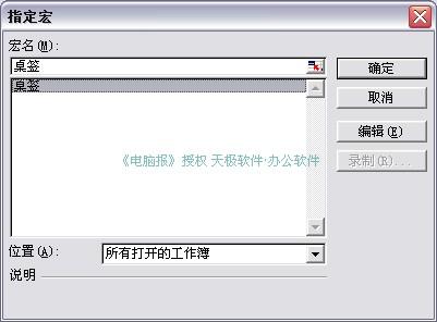 ⒈切换到Sheet1工作表中,执行“视图→工具栏→窗体”命令,展开“窗体”工具栏,单击工具栏上的“按钮”按钮,在工作表中拖拉出一个按钮,此时系统弹出“指定宏”对话框(图4),选中刚才编制的“桌签”宏,确定返回。