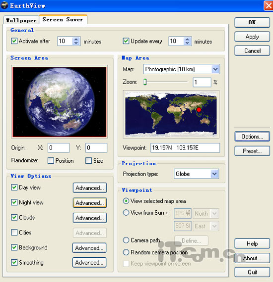 虽然Google Earth、MSN Earth极大地拓展了广大用户的视野,不过也有一些不足,如使用这类软件需要有快速的互联网连接,而且所看到的地图内容都有一定的滞后期,最重要的是,目前并没有特别清晰的国内地图。这里,笔者特向大家介绍另一款软件:EarthView,虽没有大量卫星图片可以看,但却可以模拟地球上任何一点的光照情况,而且位于黑暗中的地点将会显示出从太空中看到的城市灯光,还可以将画面当作Windows桌面或者屏幕保护。