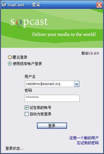 首先点击右下方的“注册一个新用户”快速简单地注册一个帐户。若是匿名登录则只能观看节目,而注册用户可以享受订阅频道、自己播放频道等功能。