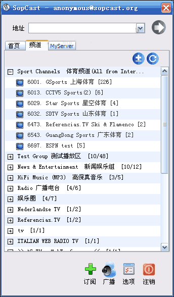 图2 客户端首页2.SopCast的频道介绍 频道界面(图3),你可以在这里看到 SopCast 的海量频道列表,点击显示或隐藏不在线的频道,手动刷新频道列表。以图中 Test Group 测试播放区为例, 10 表示为当前在线频道,“上海体育 [226]”表示有 226 人在观看该频道,想必是一场精彩的世界杯球赛了。提到球赛,SopCast缓冲时间短,网络延时也能控制在1分钟内,所以你不会感到明显的滞后,相较于同类软件是很了不得的。想看更多精彩节目,可以点击转到 SopCast 网站订阅你喜欢的频道,记住,这一切都是免费的哦!