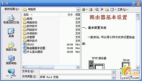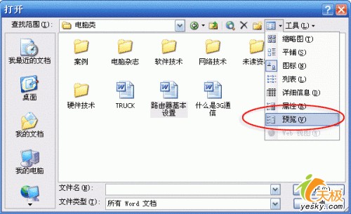 3. 这时,当我们再去点击打印按钮时,打印机便会以从后向前的顺序打印文档,而这样出来的文件就可以直接用于装订了。 【小提示】 逆序打印功能只会影响打印机的实际输出效果,而打印预览时仍会以正常页序显示,这点请大家注意 二. 文件内容我先知晓——打开预览 办公室的电脑中一般都保存着为数众多的文档,当我们打算调用其中的一份文件时,必须一个一个打开后才能知道里面的内容,效率很低。其实,我们也可以通过Word的“打开预览”功能快速获知文件的内容。 1. 在Word中点击“文件”菜单→“打开”命令 2. 在弹出的如图2所示“打开”对话框中点击“视图”菜单→“预览”命令
