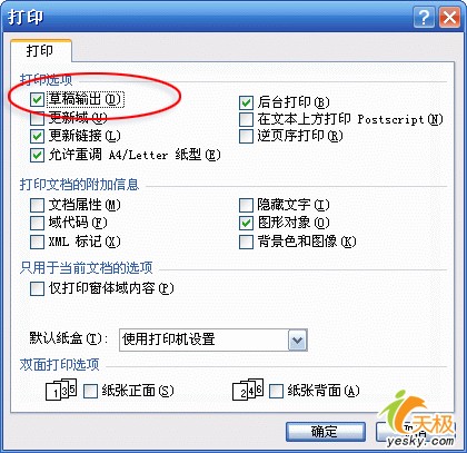 三. 预览效果还省墨水——草稿输出 我们在处理一些重要文件时,有时需要将文档实际打印出来进行版面校准,但如果使用的是喷墨打印机,那么每月光在打印样稿方面就要耗费大量的墨水了。其实,Word已经为我们提供了一个“草稿输出”功能来帮我们解决这个难题。 1. 在Word中点击“文件”菜单→“打印”命令,在弹出的“打印”对话框中再点击“选项”按钮。如图4所示
