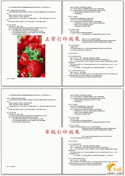2. 勾选上其中的“草稿打印”复选框后确定,再点击“打印”按钮即可打印出一份没有图片的草稿,但是草稿的格式以及图片的留空大小都与正常打印稿相符,这样,我们不仅能够像以前一样校对版面了,而且也大大降低了打印样稿时墨水的消耗。如图5所示为效果对比图(注意:草稿中图片所占的区域大小和原文档一致,只不过不再打印了)